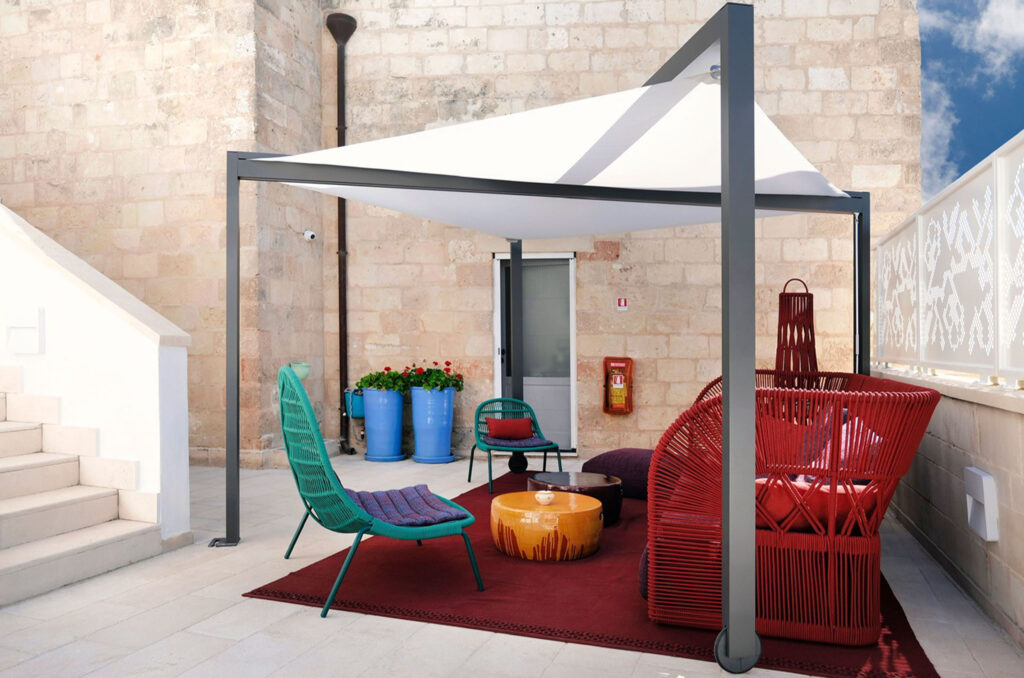 Gli eleganti tappeti Quadro formano delle isole di colore sulla pietra candida, creando un contrasto che appaga la vista e rende più intimo e raccolto l’ambiente. Ad incorniciare e proteggere questi angoli di comfort, che ben rispecchiano il mood della Dimora San Giuseppe Hotel, dei solidi sun sail della collezione MrX dalle linee moderne e minimal che permettono di godere della splendida vista in totale tranquillità.