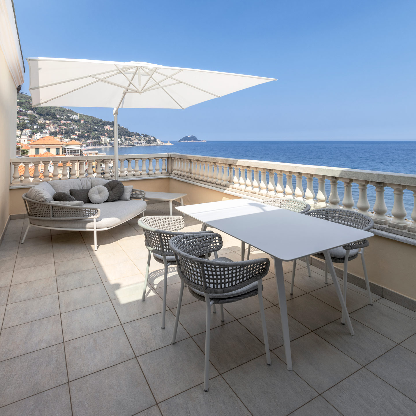 Le ampie aree living delle terrazze invece, sono arredate con un mix di sedute Moon alu con tessuti dai colori tenui, sobri e raffinati.