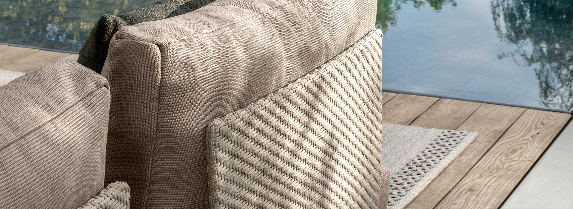 Filo di polipropilene mano lino che viene lavorato mediante ritorcitura, così da ottenere il filato tubolare caratteristico di questo tessuto. Filato riciclabile al 100%, resistente a funghi e batteri.