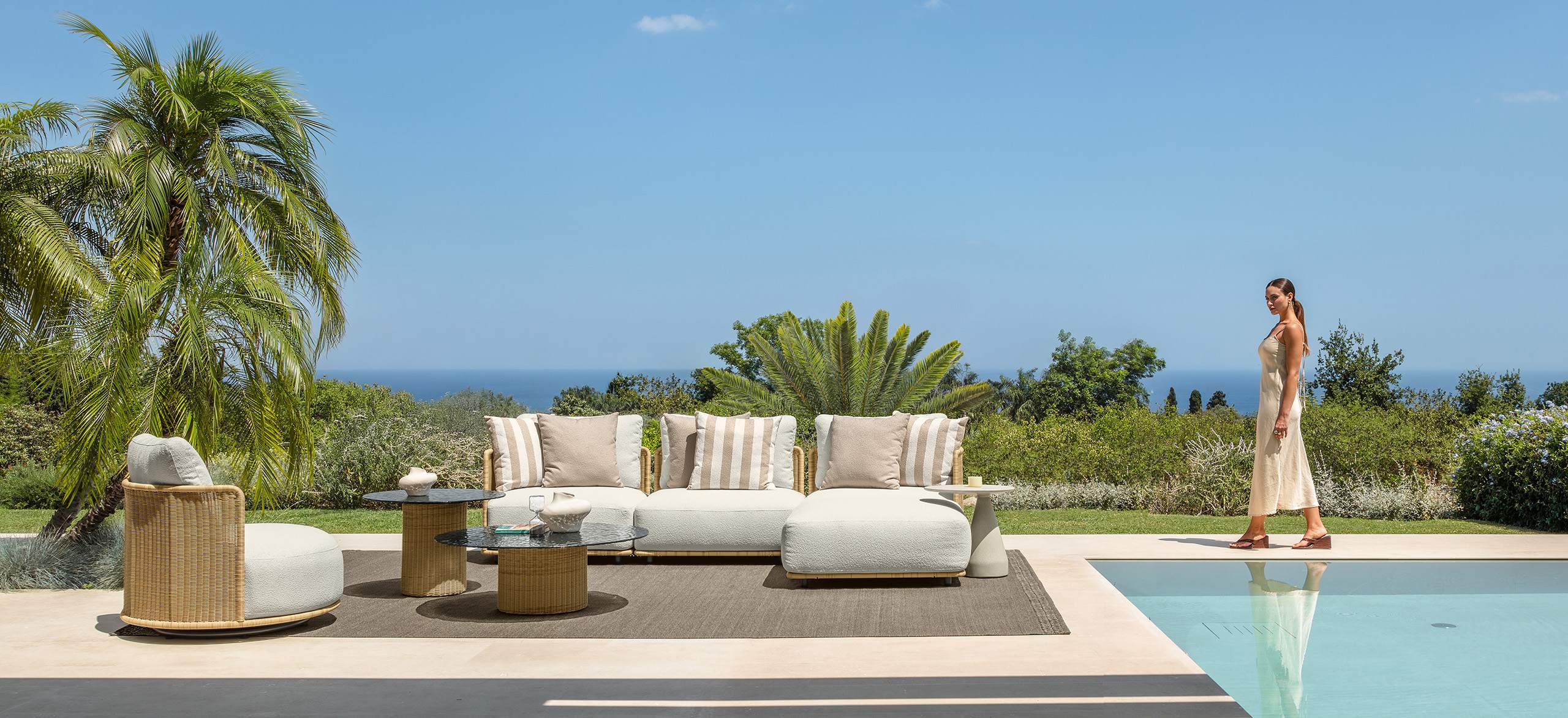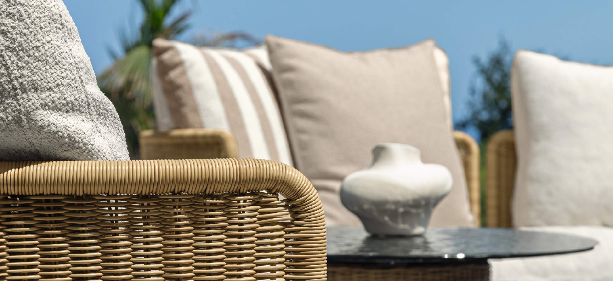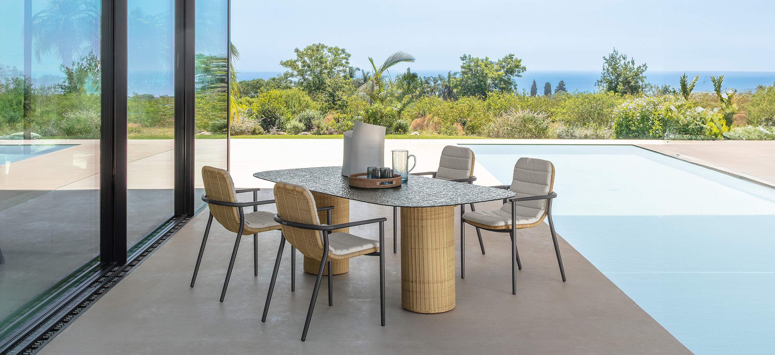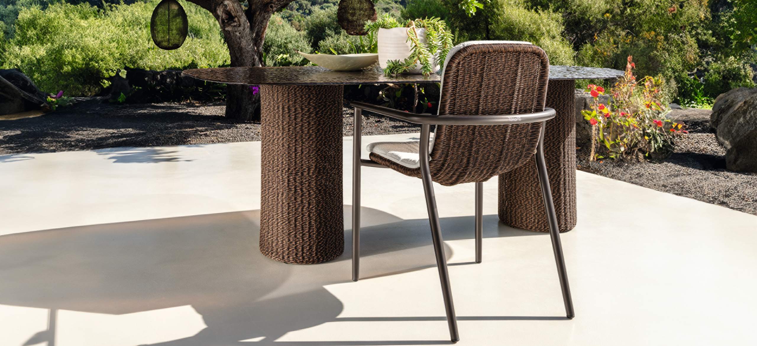 Bond è ispirata al concetto di unione, di vicinanza, che si esprime proprio attraverso l’accostamento dei singoli moduli. La forma arrotondata dei cuscini di seduta enfatizza questo legame e gioca sulle ombre create dai volumi. Le sedute, estremamente generose, ma compatte nella profondità, sono di grande impatto e rendono il sofa un arredo dalla manifesta comodità. La struttura in tubolare di alluminio è rivestita in midollino e completa la parte architettonica dell’oggetto. Il comfort viene garantito inoltre da una generosa cuscineria deco. La famiglia si completa di sedute living girevoli, lounge e dining che riprendono l’intreccio del sofa, in colore chiaro o più intenso, sostenuto delicatamente da una struttura in alluminio la cui forma varia in modo dinamico creando un piacevole movimento e senso leggerezza. I top dei tavoli caffè e pranzo portano innovazione tra i materiali della gamma Talenti: in appoggio su una o più strutture di forma cilindrica sono composti di un piano in vetro texturizzato, con nuances che vanno dal caffè al grigio fumo, e che rimandano ai profili della terra.