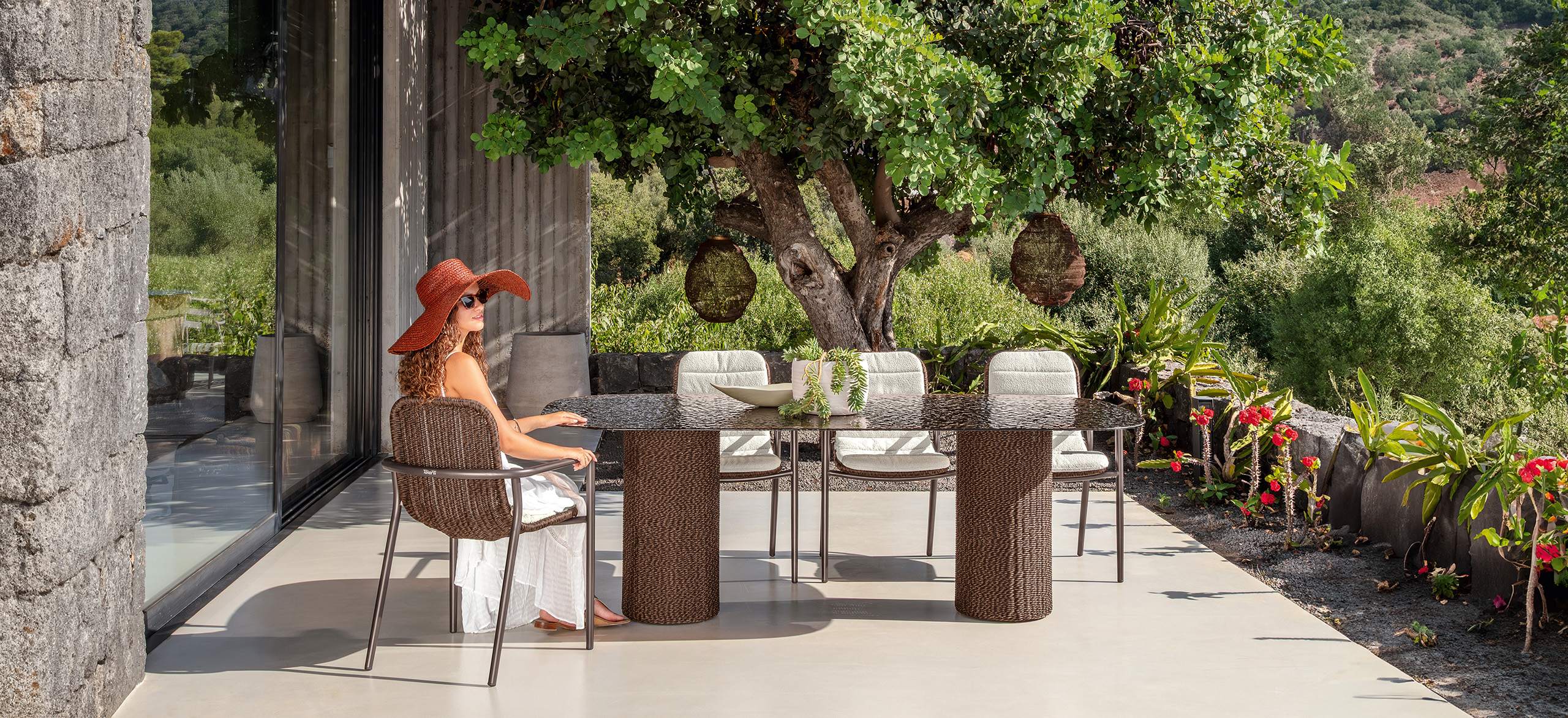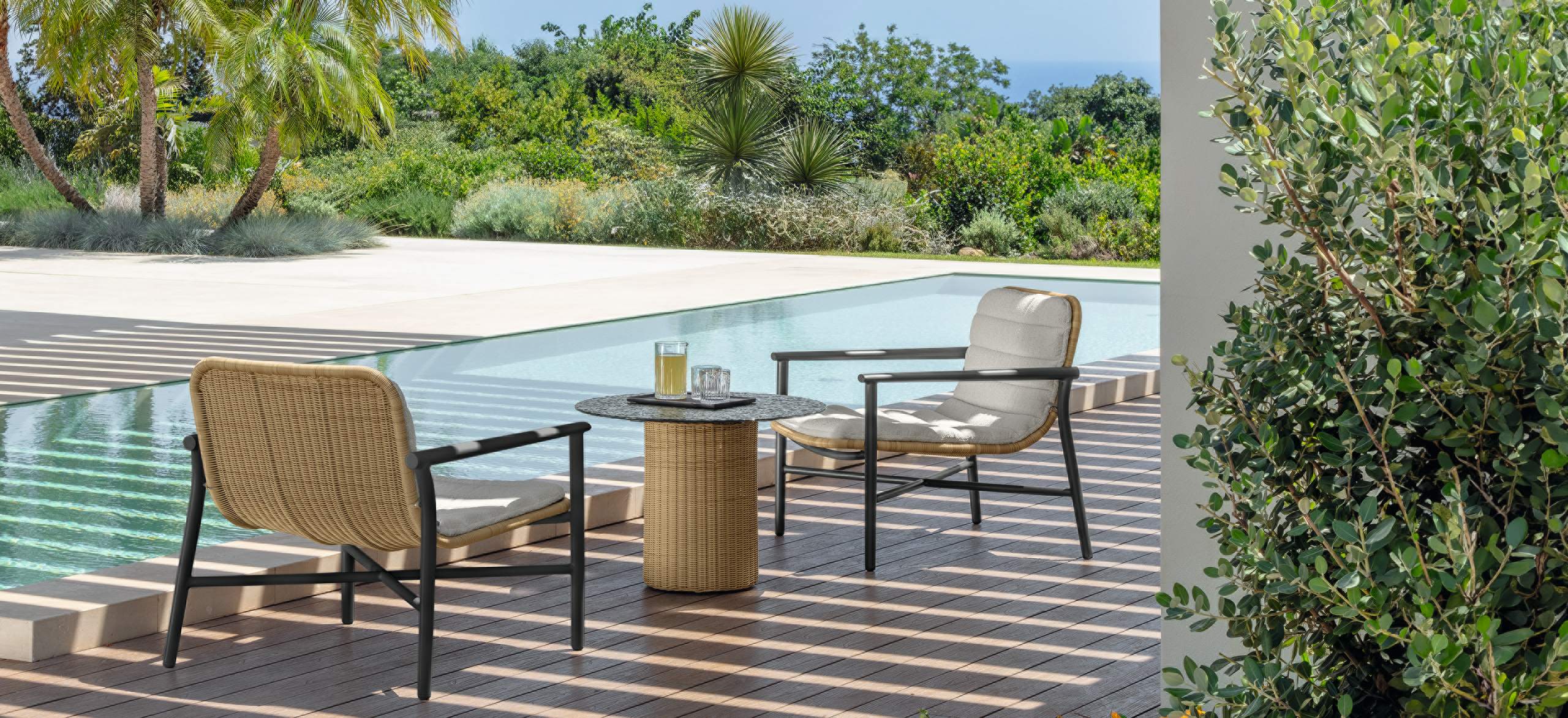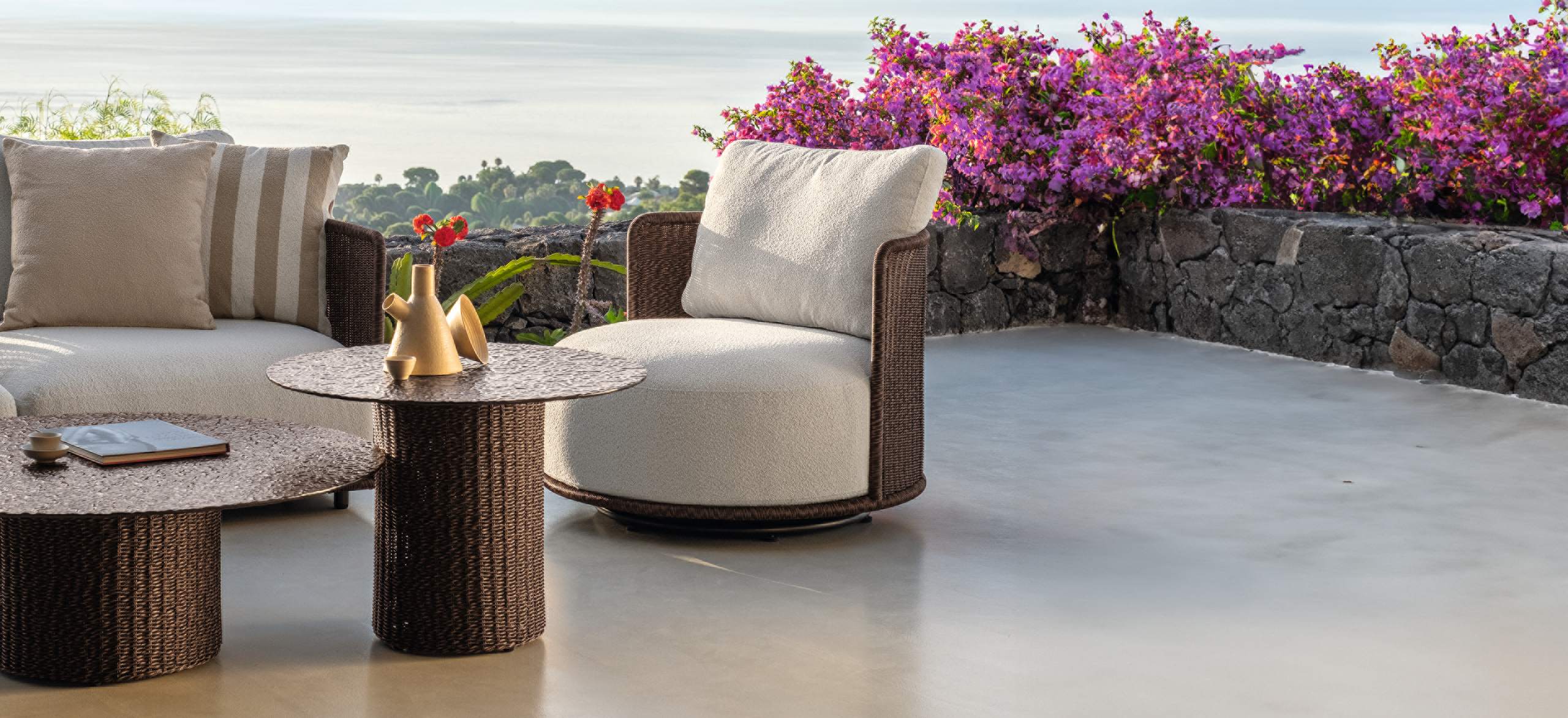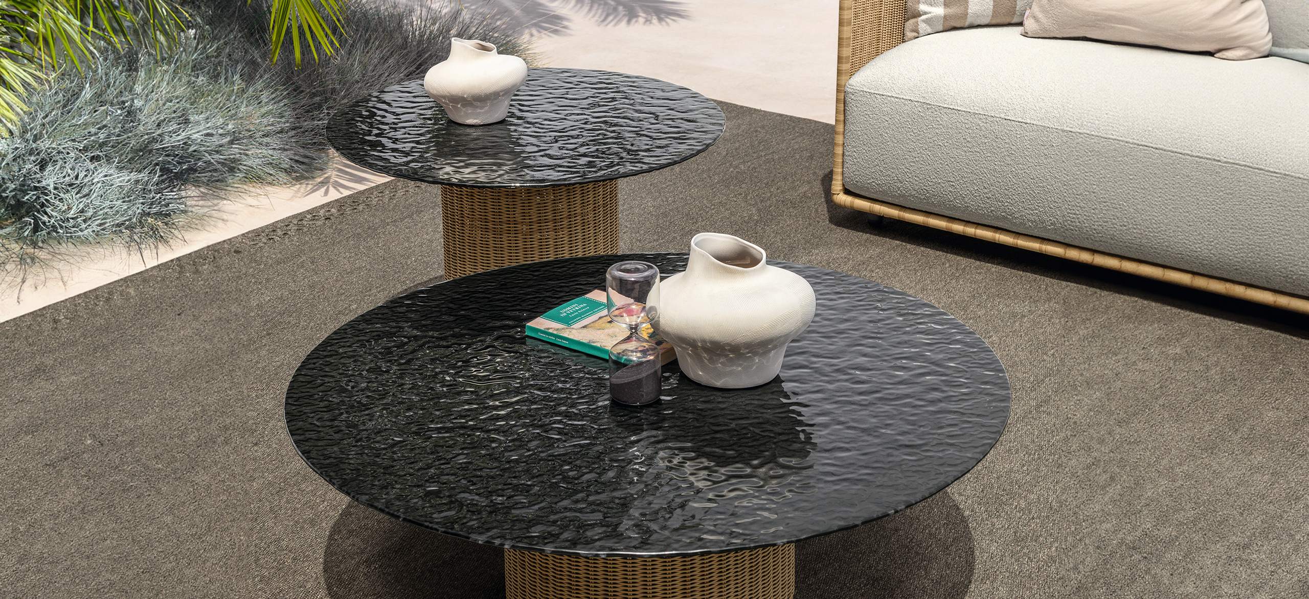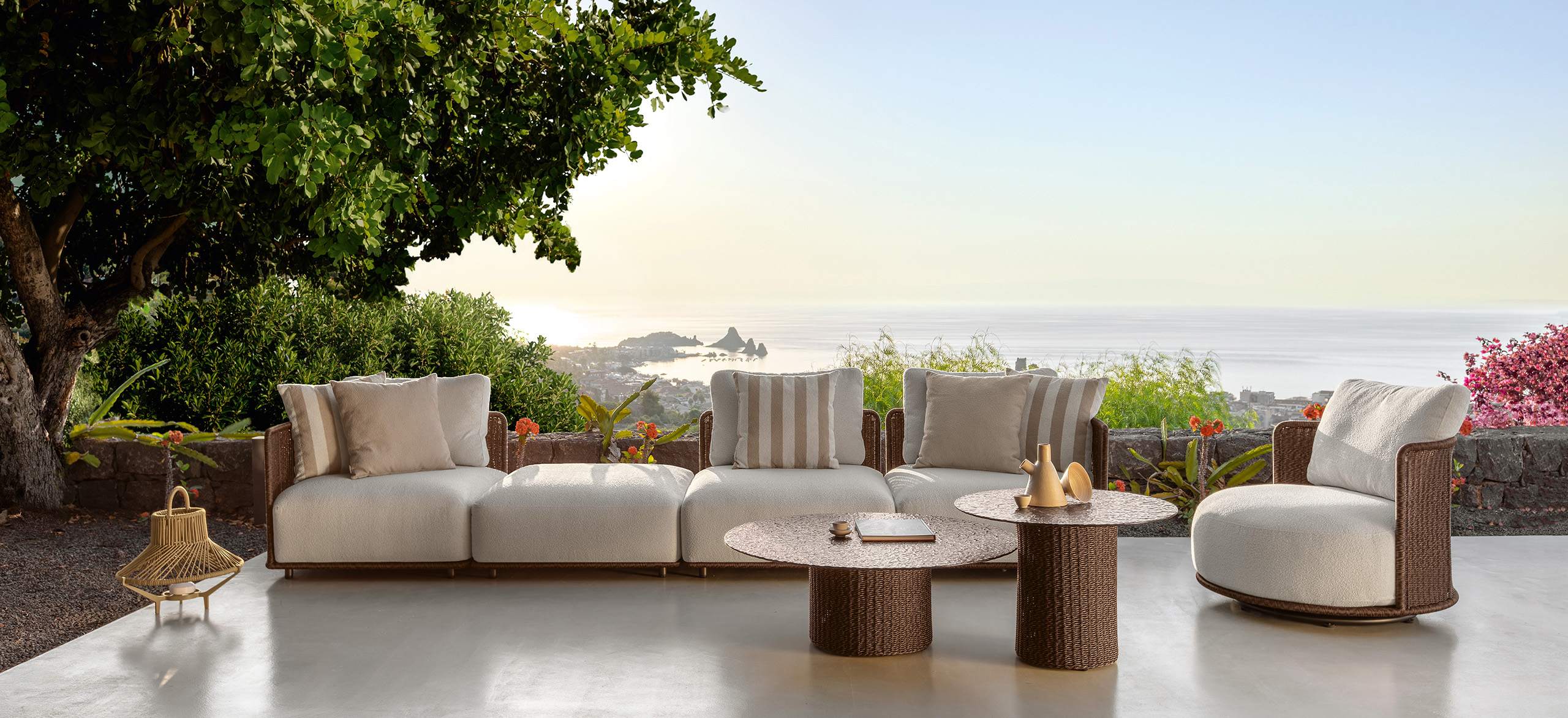 Bond è ispirata al concetto di unione, di vicinanza, che si esprime proprio attraverso l’accostamento dei singoli moduli. La forma arrotondata dei cuscini di seduta enfatizza questo legame e gioca sulle ombre create dai volumi. Le sedute, estremamente generose, ma compatte nella profondità, sono di grande impatto e rendono il sofa un arredo dalla manifesta comodità. La struttura in tubolare di alluminio è rivestita in midollino e completa la parte architettonica dell’oggetto. Il comfort viene garantito inoltre da una generosa cuscineria deco. La famiglia si completa di sedute living girevoli, lounge e dining che riprendono l’intreccio del sofa, in colore chiaro o più intenso, sostenuto delicatamente da una struttura in alluminio la cui forma varia in modo dinamico creando un piacevole movimento e senso leggerezza. I top dei tavoli caffè e pranzo portano innovazione tra i materiali della gamma Talenti: in appoggio su una o più strutture di forma cilindrica sono composti di un piano in vetro texturizzato, con nuances che vanno dal caffè al grigio fumo, e che rimandano ai profili della terra.