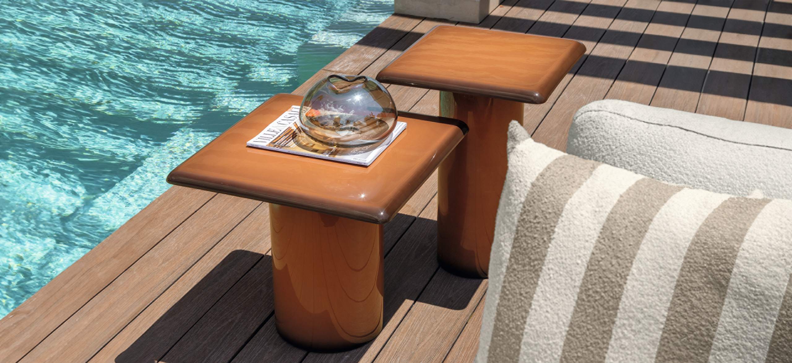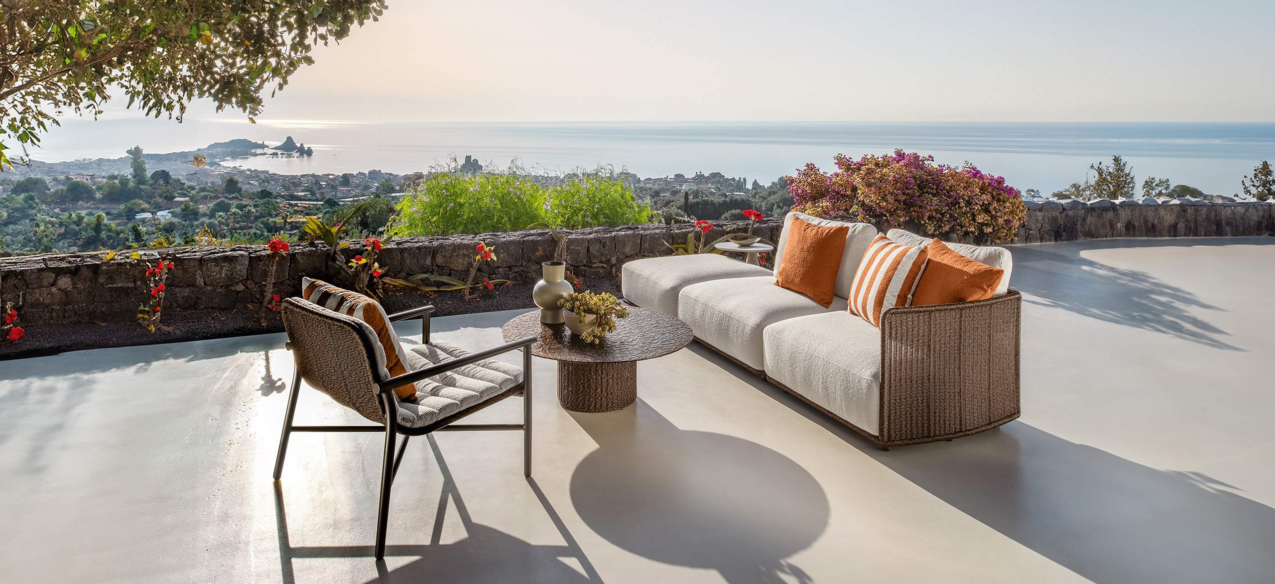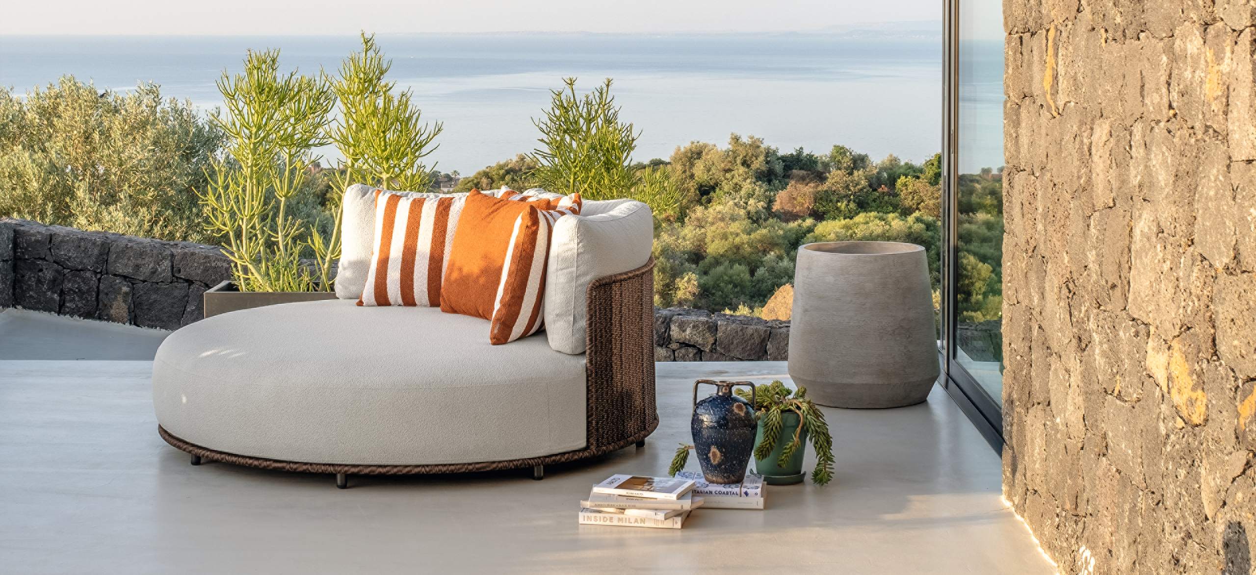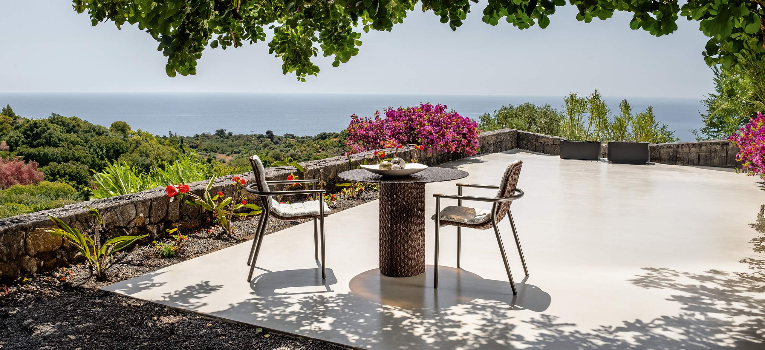 Bond è ispirata al concetto di unione, di vicinanza, che si esprime proprio attraverso l’accostamento dei singoli moduli. La forma arrotondata dei cuscini di seduta enfatizza questo legame e gioca sulle ombre create dai volumi. Le sedute, estremamente generose, ma compatte nella profondità, sono di grande impatto e rendono il sofa un arredo dalla manifesta comodità. La struttura in tubolare di alluminio è rivestita in midollino e completa la parte architettonica dell’oggetto. Il comfort viene garantito inoltre da una generosa cuscineria deco. La famiglia si completa di sedute living girevoli, lounge e dining che riprendono l’intreccio del sofa, in colore chiaro o più intenso, sostenuto delicatamente da una struttura in alluminio la cui forma varia in modo dinamico creando un piacevole movimento e senso leggerezza. I top dei tavoli caffè e pranzo portano innovazione tra i materiali della gamma Talenti: in appoggio su una o più strutture di forma cilindrica sono composti di un piano in vetro texturizzato, con nuances che vanno dal caffè al grigio fumo, e che rimandano ai profili della terra.