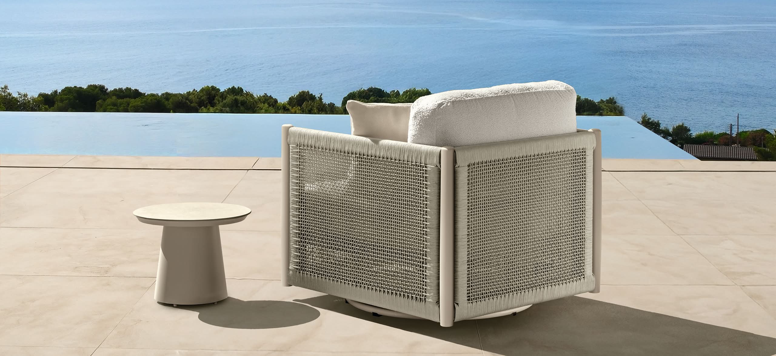 Dolcevita si evolve restando fedele a sé stessa, combinando la semplicità delle linee della versione in teak alla versatilità dell’alluminio. Una collezione dal carattere deciso, ma dallo stile raffinato, i cui elementi living, dining e relax nella duplice colorazione warm white e grafite, sono caratterizzate dalla lavorazione in corda finemente intrecciata, top in ceramica e cuscini dai colori neutri, dando vita ad una collezione capace di interpretare in vivere outdoor anche nei più piccoli spazi, con un tocco di modernità e personalità.