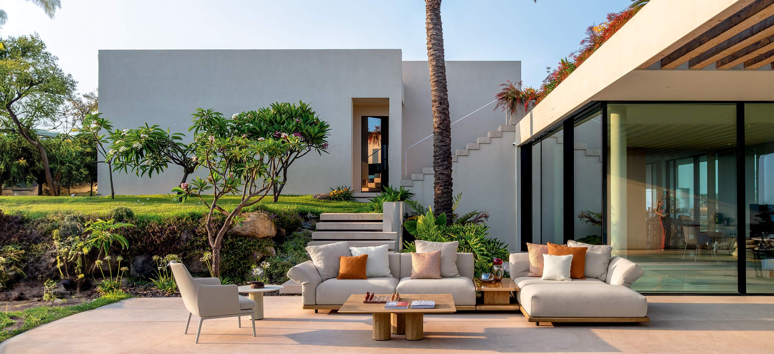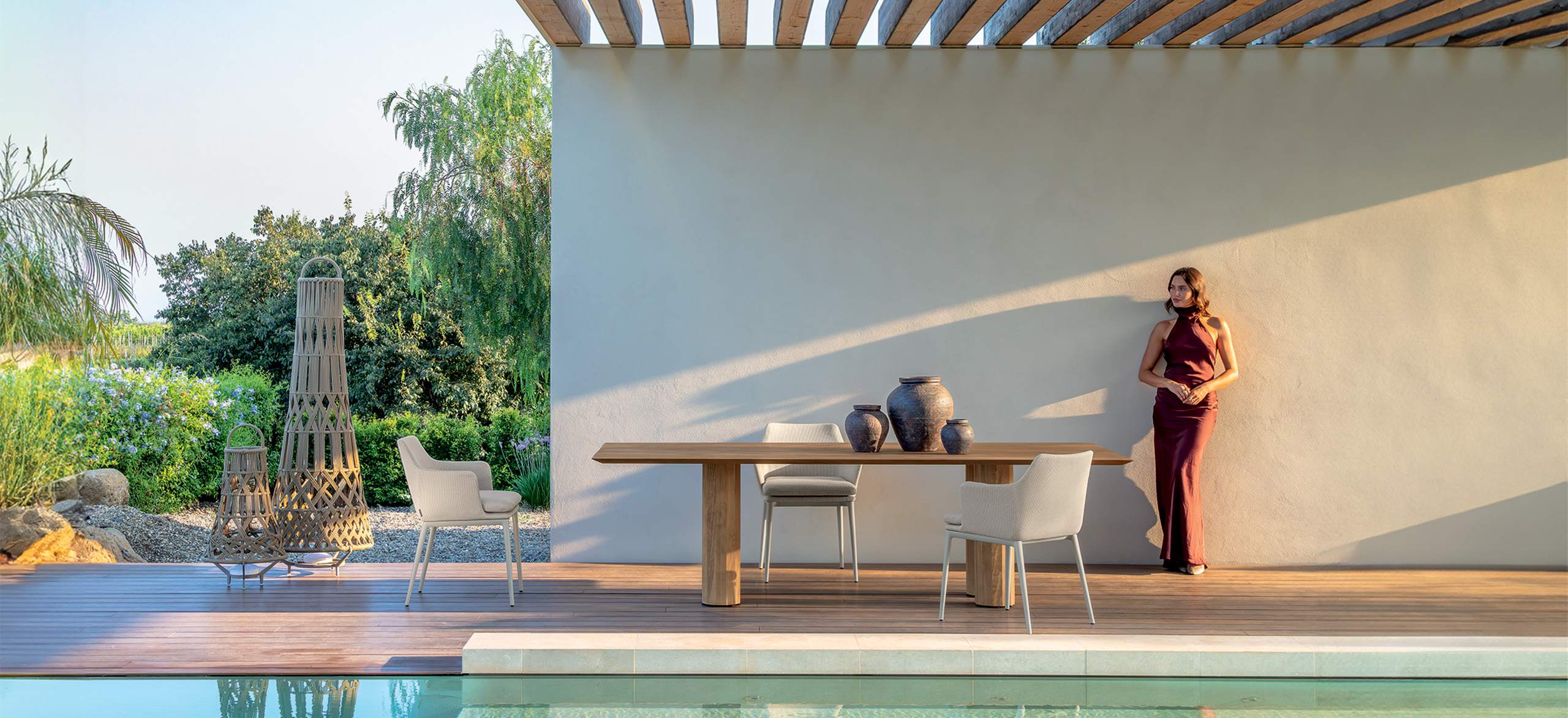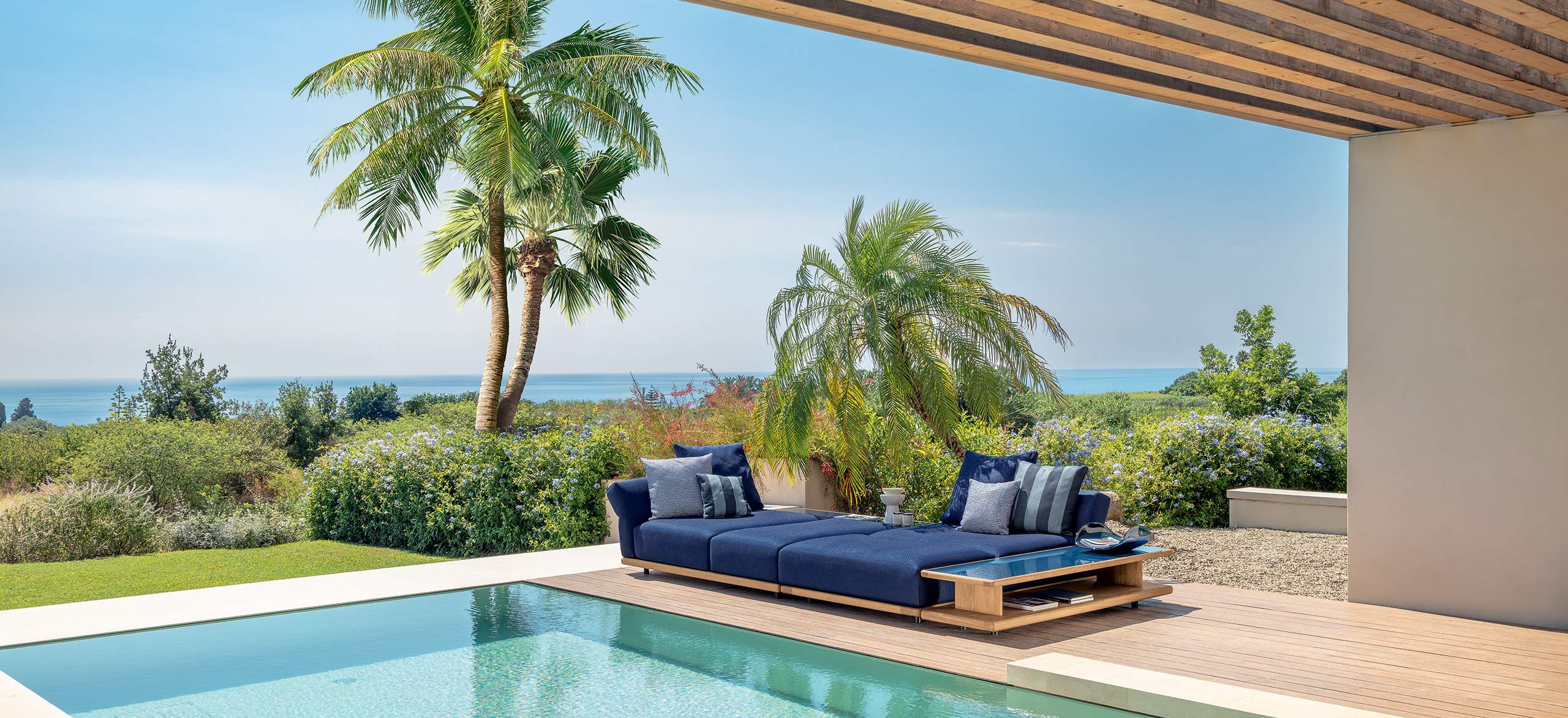 Elton è una collezione che sublima la capacità di Talenti di assottigliare i confini tra l’indoor e l’outdoor attraverso la ricercatezza delle forme e dei materiali. Una componibilità senza pari che introduce un nuovo modo di vivere gli spazi esterni: per la prima volta schienali e braccioli dei sofa diventano inclinabili grazie ad un meccanismo integrato nella struttura che ne consente la regolazione. Tecnologia a servizio del design, in grado di donare al divano una sinuosità estetica senza precedenti e di giocare sulla possibilità di personalizzare in toto il proprio comfort. La collezione si compone inoltre di tavoli caffè in caldo Accoya, natural o palissandro, impreziositi da eleganti top in vetro smaltato.