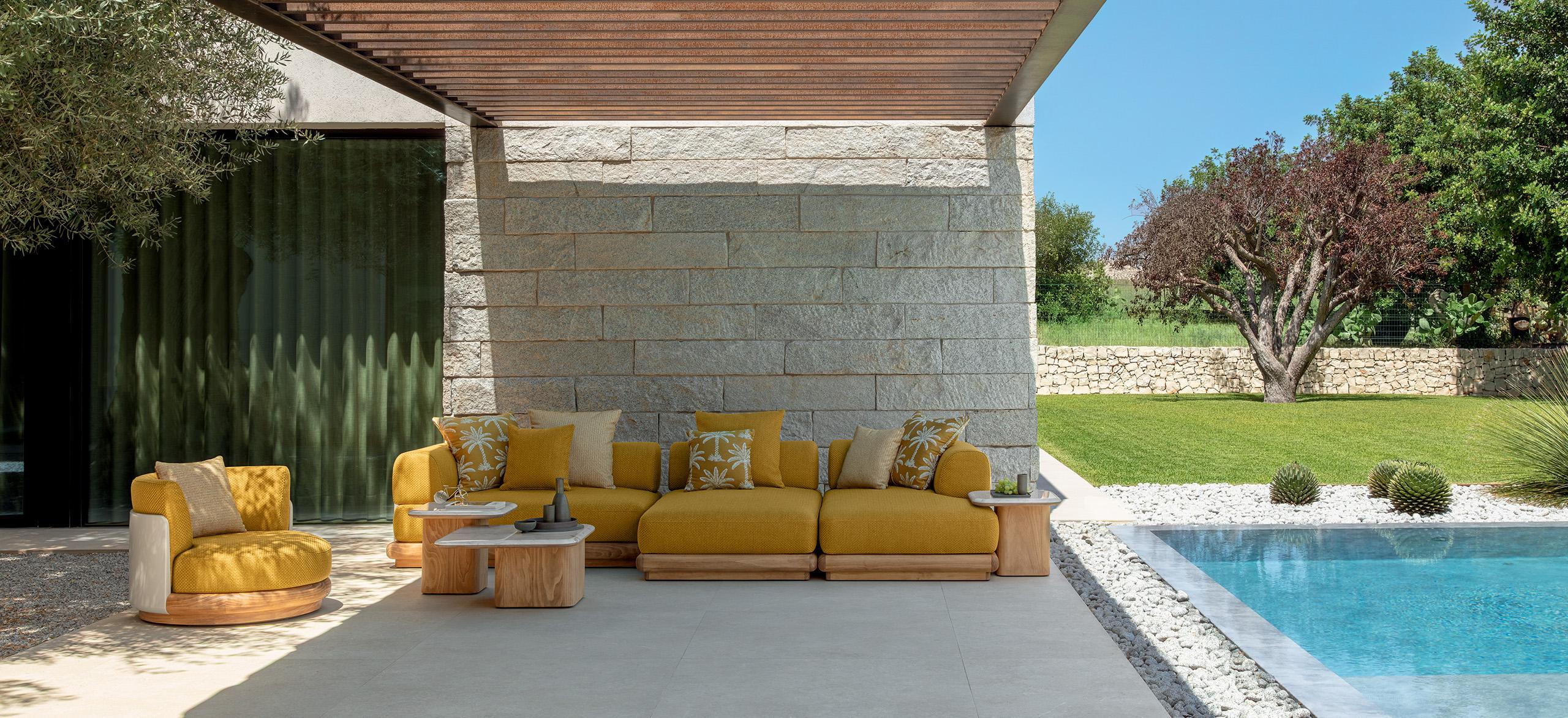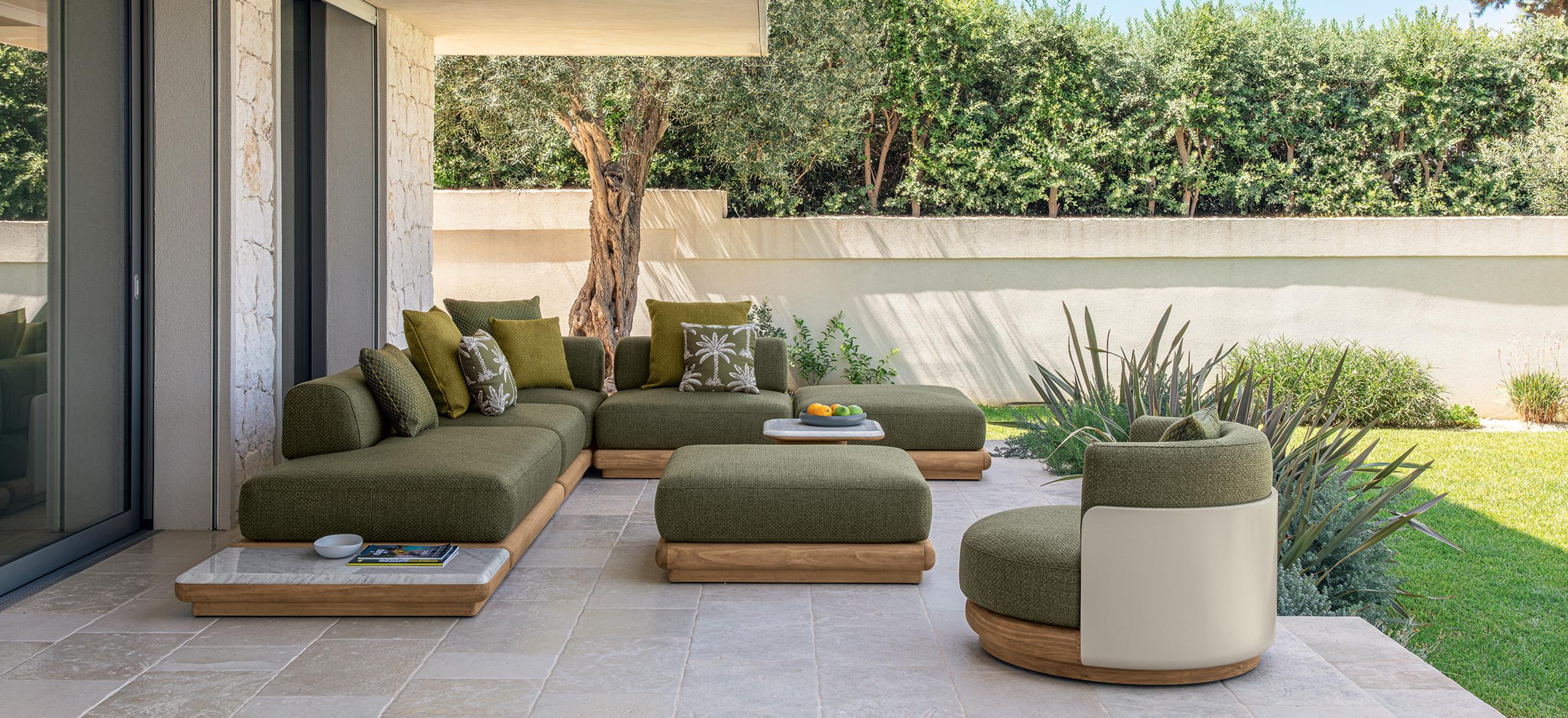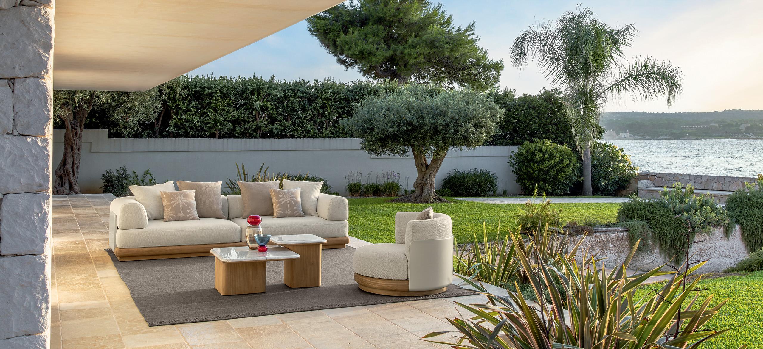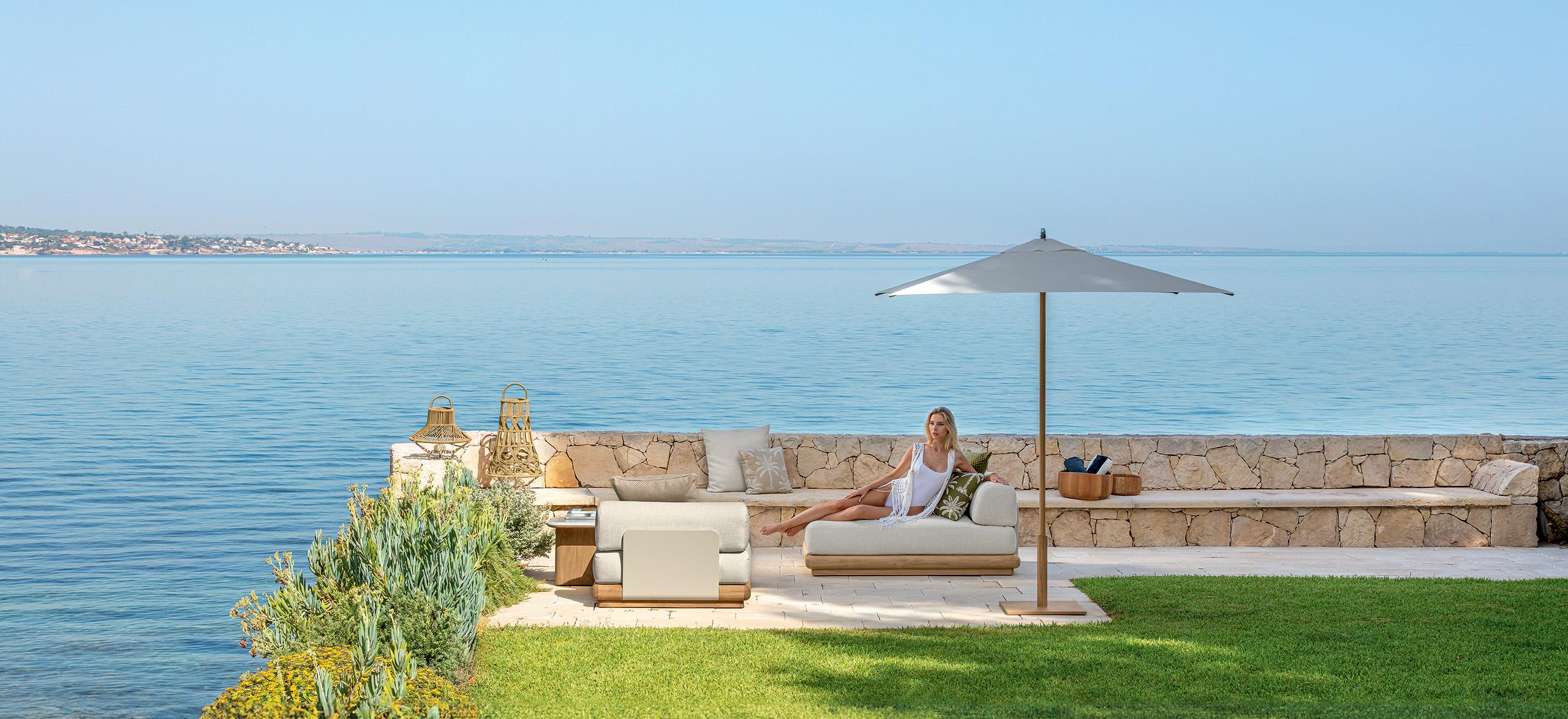 Itaca è un invito a vivere il proprio spazio outdoor con eleganza e comfort, attraverso una componibilità senza precedenti. Ispirandosi all’iconico viaggio di Ulisse per mari e terre lontane, Carlo Colombo dà vita ad un’oasi di piacere in cui ritrovarsi, per godere della familiarità del proprio angolo di paradiso all’aperto. Proprio come isole di un arcipelago, i variopinti moduli di Itaca si aggregano e si dividono per formare composizioni sempre originali, in continuo movimento e in grado di adattarsi ad ogni esigenza di spazio o utilizzo. I profili arrotondati, come fossero addolciti dalle onde, caratterizzano l’Accoya®, utilizzato per le solide basi, nelle varianti color miele e palissandro, e si ripropongono nelle sezioni di marmo e travertino che impreziosiscono i tavoli caffè e pranzo a completamento della collezione.