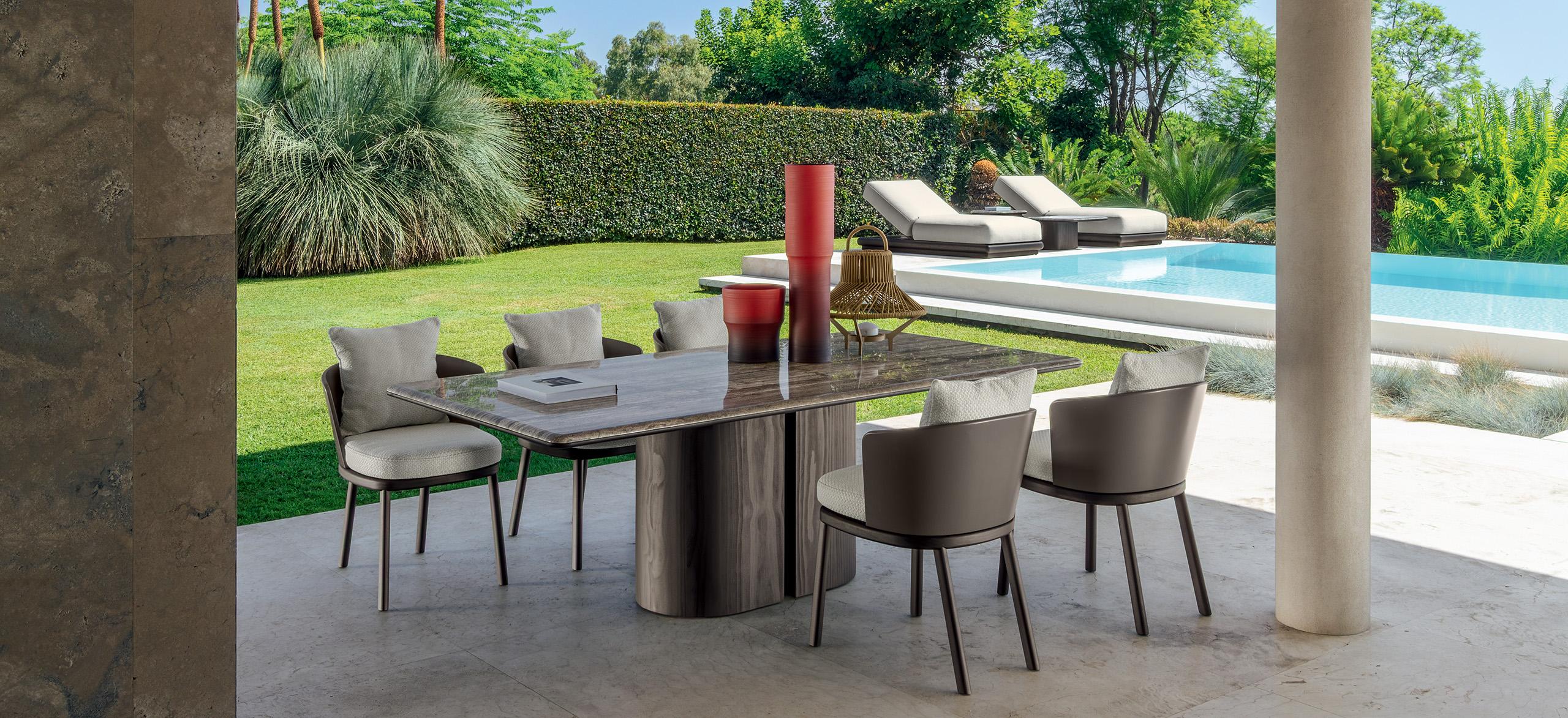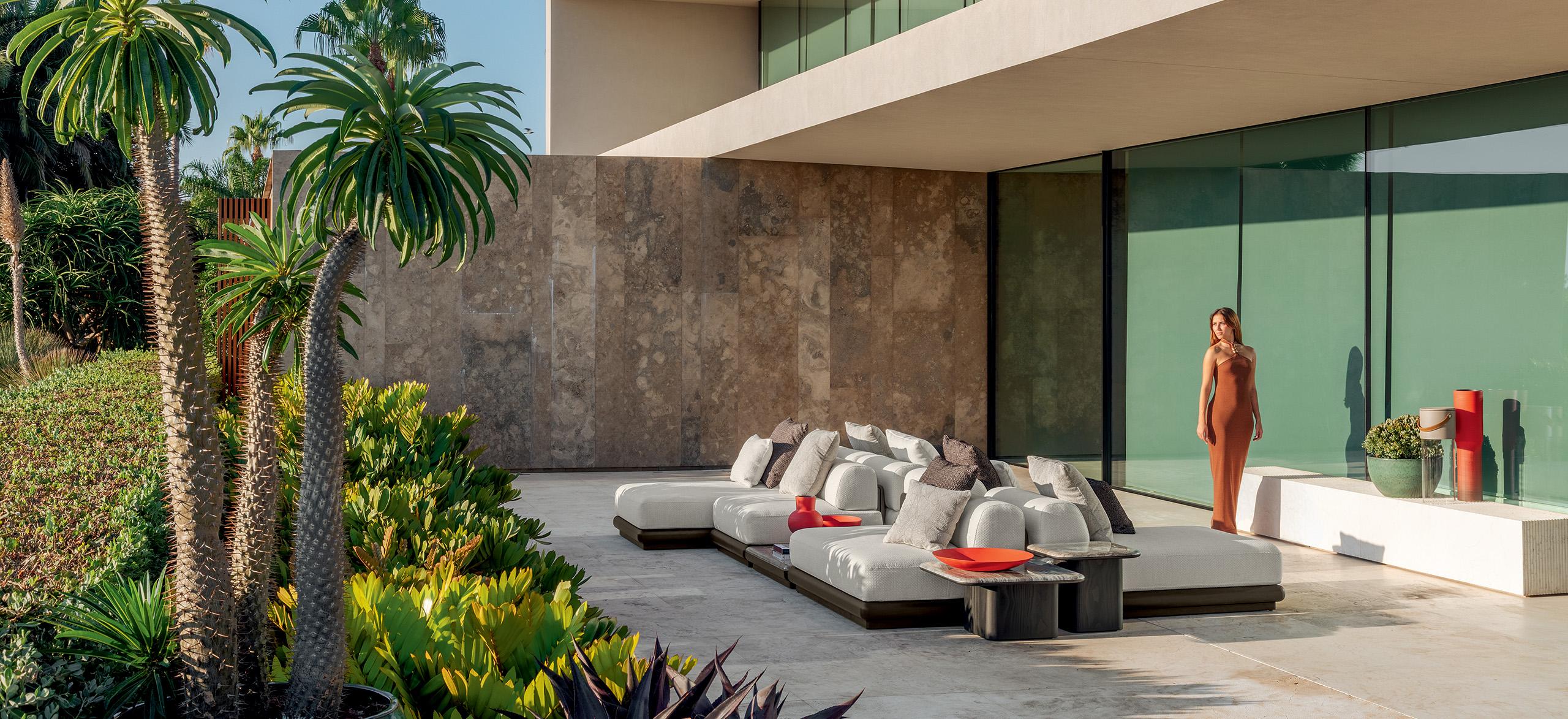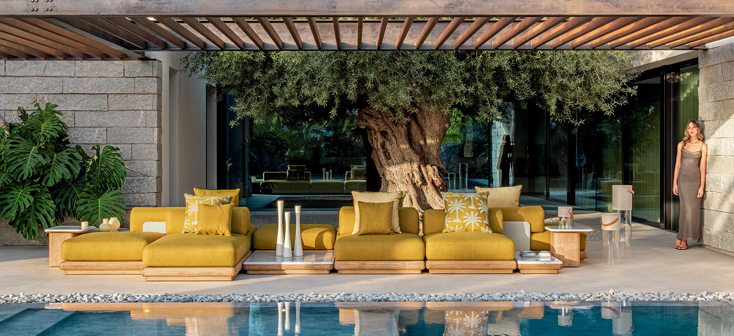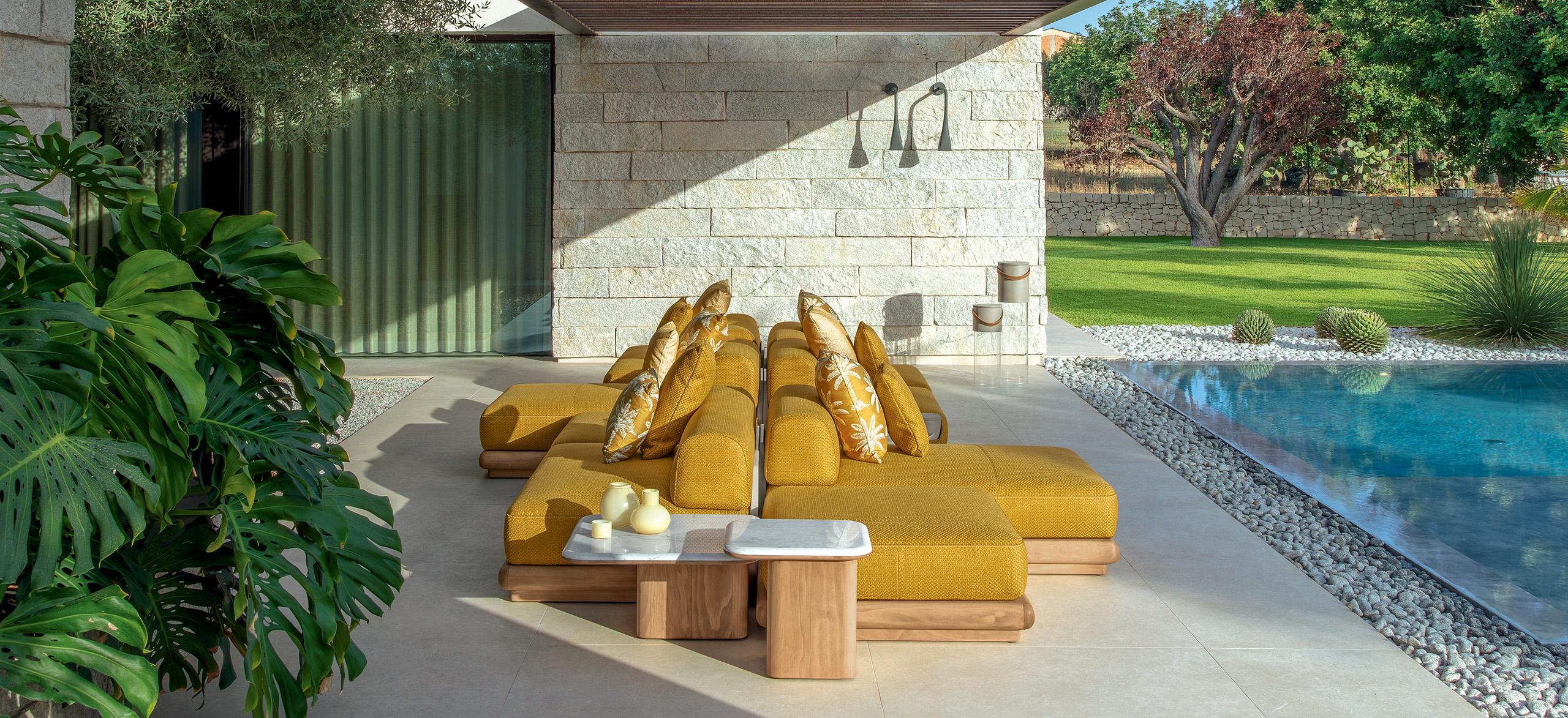 Itaca è un invito a vivere il proprio spazio outdoor con eleganza e comfort, attraverso una componibilità senza precedenti. Ispirandosi all’iconico viaggio di Ulisse per mari e terre lontane, Carlo Colombo dà vita ad un’oasi di piacere in cui ritrovarsi, per godere della familiarità del proprio angolo di paradiso all’aperto. Proprio come isole di un arcipelago, i variopinti moduli di Itaca si aggregano e si dividono per formare composizioni sempre originali, in continuo movimento e in grado di adattarsi ad ogni esigenza di spazio o utilizzo. I profili arrotondati, come fossero addolciti dalle onde, caratterizzano l’Accoya®, utilizzato per le solide basi, nelle varianti color miele e palissandro, e si ripropongono nelle sezioni di marmo e travertino che impreziosiscono i tavoli caffè e pranzo a completamento della collezione.