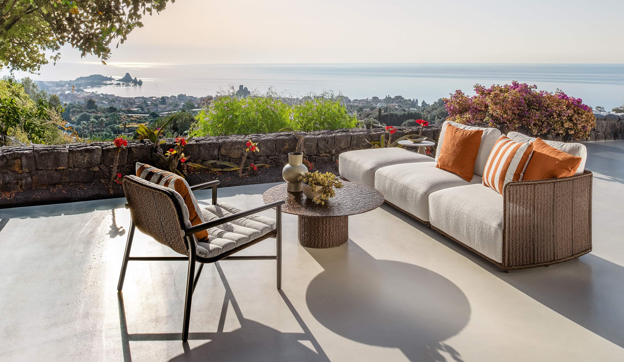 Il divano modulare Bond è un sistema di sedute che interpreta in chiave contemporanea il concetto di unione e convivialità. Ogni modulo dialoga con l’altro attraverso linee morbide e proporzioni generose, pensate per accogliere con naturalezza. La forma arrotondata dei cuscini esalta il gioco di volumi e ombre, restituendo un’armonia visiva che si sposa con la comodità tangibile della seduta. La struttura in tubolare di alluminio, rivestita in elegante intreccio di midollino, conferisce leggerezza architettonica e resistenza, mentre la cuscineria deco, soffice e avvolgente, amplifica il senso di relax. La componibilità permette di creare soluzioni dinamiche e versatili, adattandosi a spazi e contesti differenti senza mai perdere il proprio carattere distintivo.