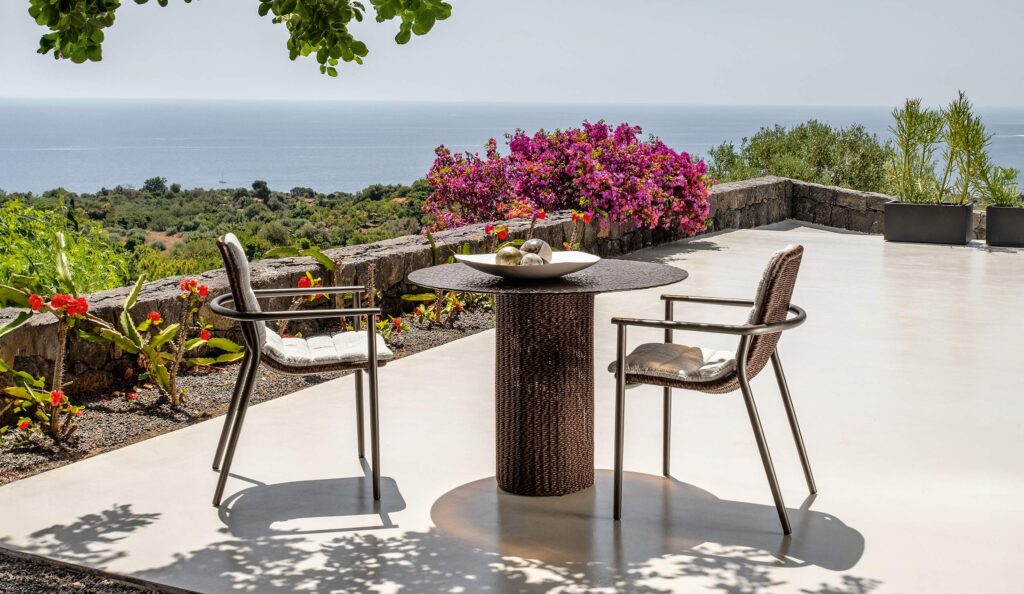 Il tavolo dining Bond è una dichiarazione di stile che celebra la convivialità all’aperto. La base cilindrica rivestita in midollino, dalle linee pure ed essenziali, sostiene un piano da 100 cm di diametro in vetro texturizzato, le cui nuances variano tra il caffè e il grigio fumo. L’effetto materico e raffinato del top si unisce alla leggerezza visiva della struttura, creando un equilibrio tra solidità e trasparenza. Progettato per ospitare momenti di condivisione, in ambito residenziale e hospitality, diventa il fulcro dello spazio dining, fondendo innovazione e tradizione in un’unica, elegante presenza.