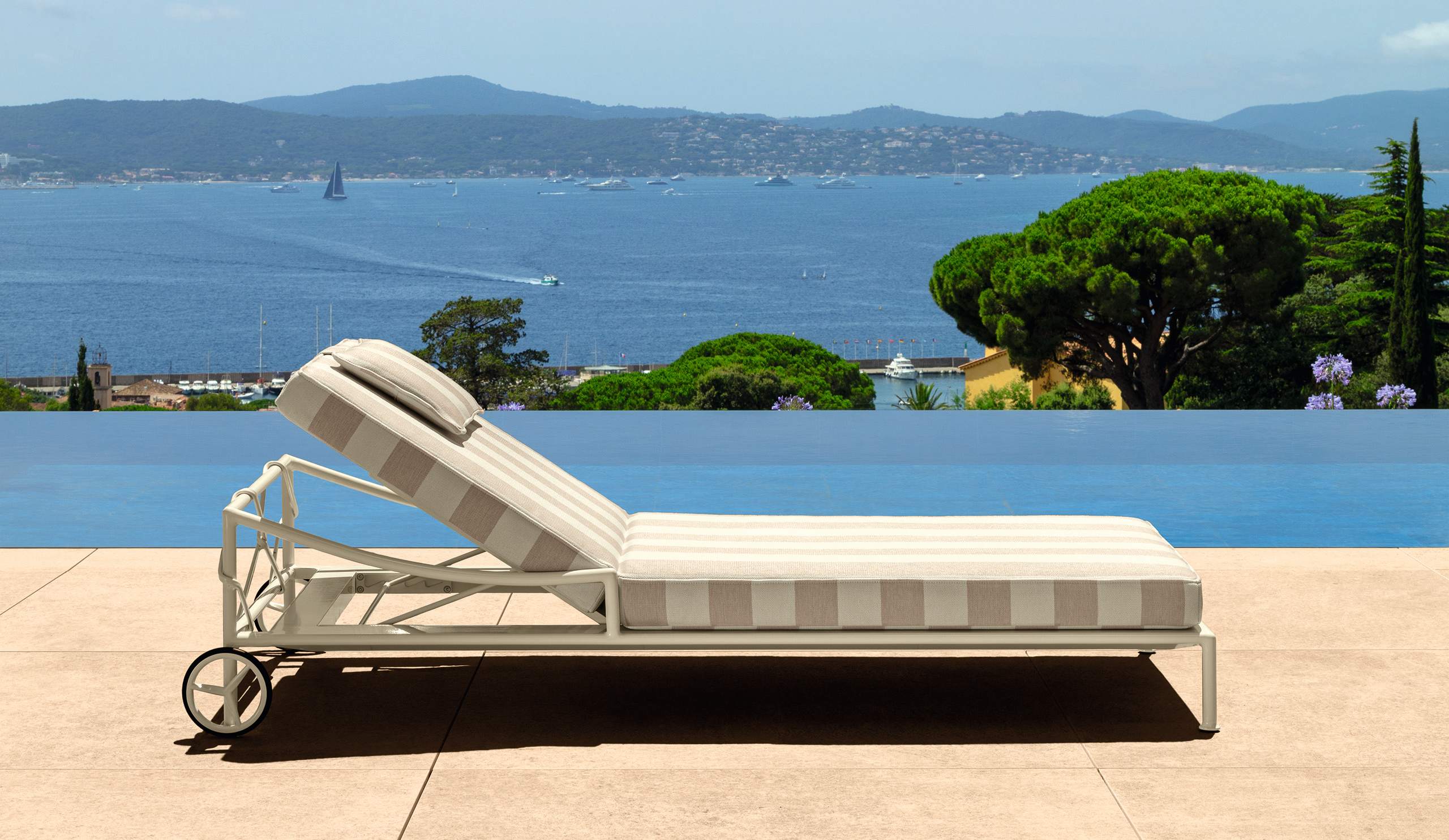 Il lettino Capri traduce l’eleganza della collezione in una forma essenziale e raffinata, pensata per vivere il relax outdoor con leggerezza e stile. La struttura in alluminio, caratterizzata da un disegno sottile e ricercato, richiama con delicatezza la lavorazione del ferro battuto in chiave contemporanea. Le linee morbide e l’inclinazione regolabile dello schienale offrono comfort e armonia visiva, mentre le ruote posteriori rendono il lettino facilmente movimentabile.