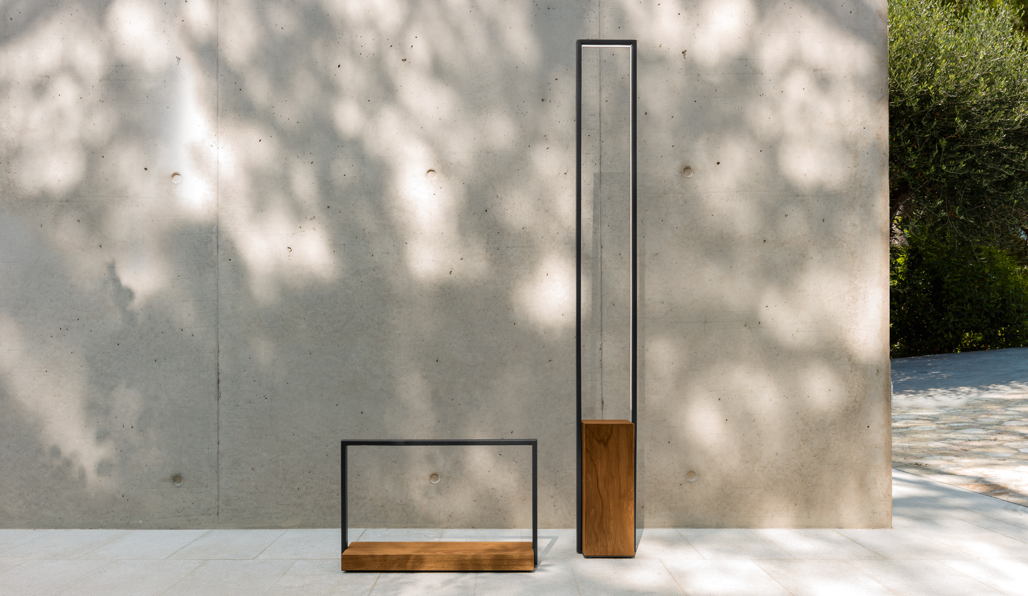 La lampada L Casilda è un elemento illuminante pensato in abbinamento perfetto con gli arredi da esterno della stessa collezione. La struttura geometrica è in acciaio inox verniciato a polvere abbinato ad una base in legno iroko.