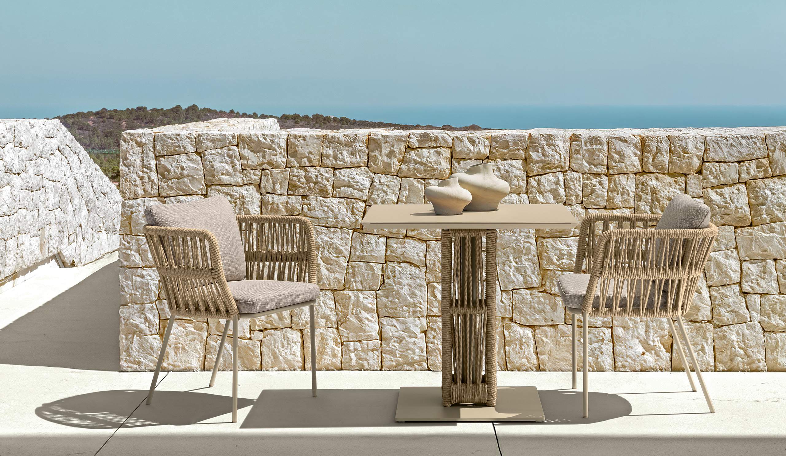 L’intreccio di corde della collezione Cliff sostiene il piano in alluminio di forma quadrata 80×80. La struttura in tubolari metallici è nascosta dalla corda che sembra sorreggere il piano richiamando il gioco di chiaroscuri che si ritrova anche negli altri elementi della collezione Cliff. La struttura è in alluminio verniciato a polvere nei colori Beige e Grafite, le basi dei tavoli prevedono un intreccio di corde in tessuto sintetico in tinta al colore del piano.