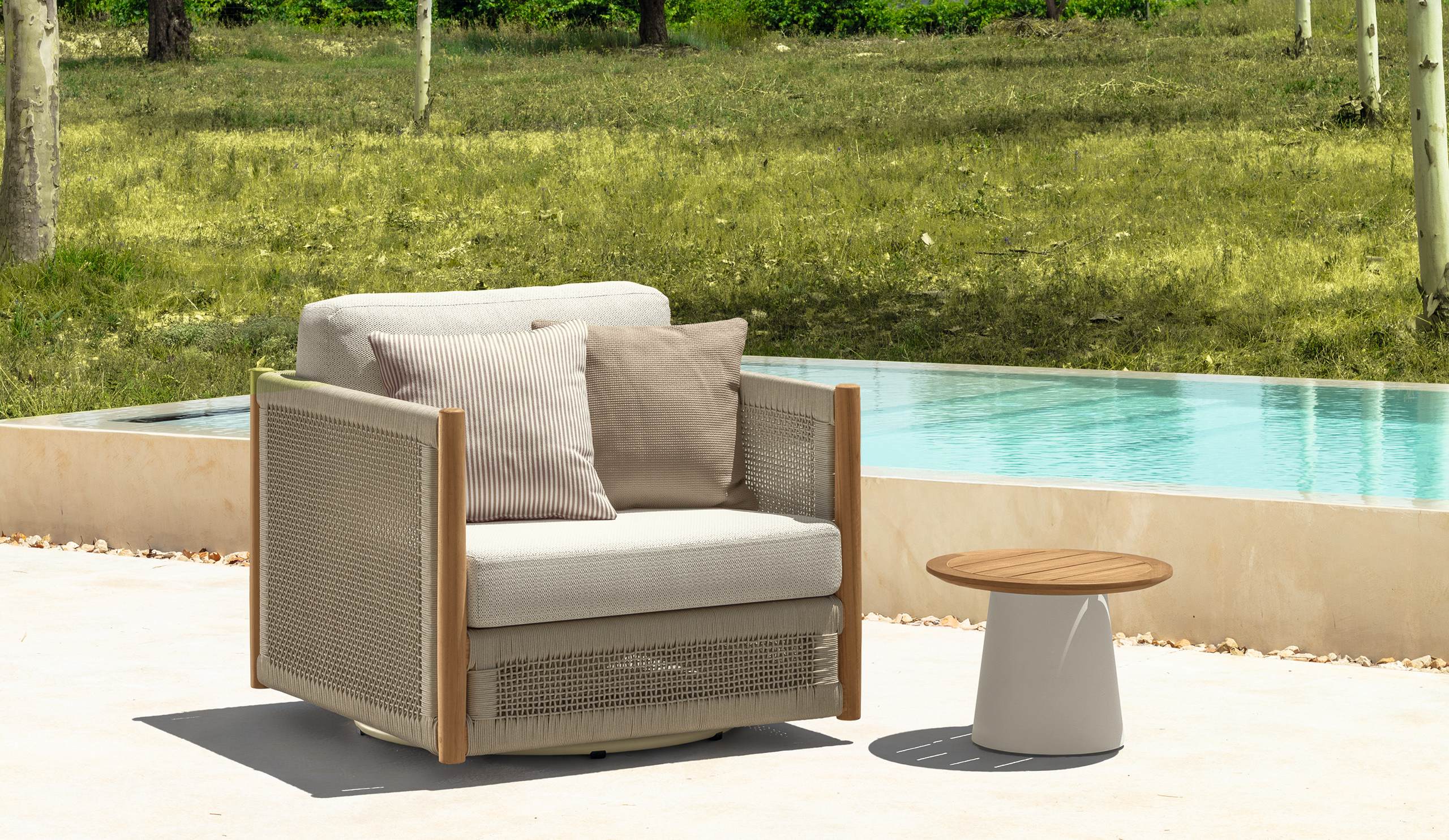 Pensata per accompagnare i momenti di relax all’aperto, la Poltrona Living Dolcevita racchiude la leggerezza e l’eleganza delle sere d’estate. La struttura in legno, impreziosita da un fitto intreccio di corde che ne esalta la matericità, si unisce a una base girevole che introduce una piacevole sensazione di movimento e libertà. Le linee morbide e avvolgenti accolgono il corpo con naturale comfort, mentre le diverse varianti cromatiche permettono di inserirla con stile in qualsiasi ambiente outdoor, regalando un tocco di raffinata freschezza.