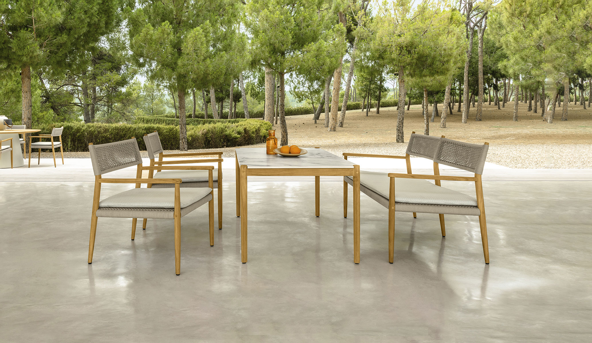 Ispirato alle calde sere d’estate, il tavolo da pranzo Dolcevita è perfetto per i momenti di convivialità. La struttura semplice lascia emergere la cura per i dettagli e la naturale bellezza del teak e del gres. Le texture seducenti di questi materiali irradiano un’atmosfera leggera e fresca, che caratterizza con stile, giardino e living esterno.
