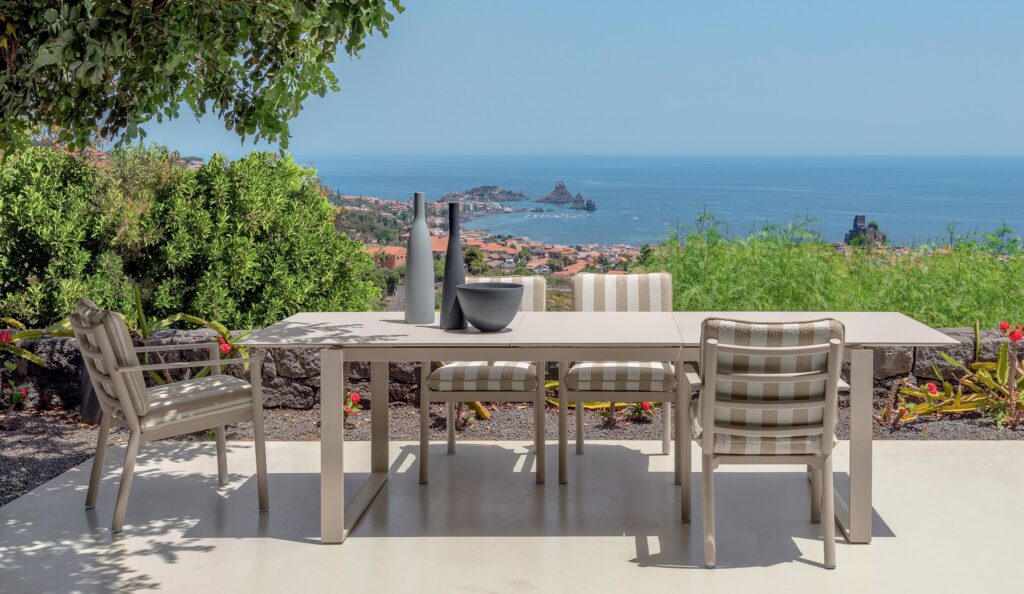 Il tavolo Finn completa la collezione con un segno deciso e architettonico: base a slitta in alluminio, resistente alle intemperie e facile da mantenere.