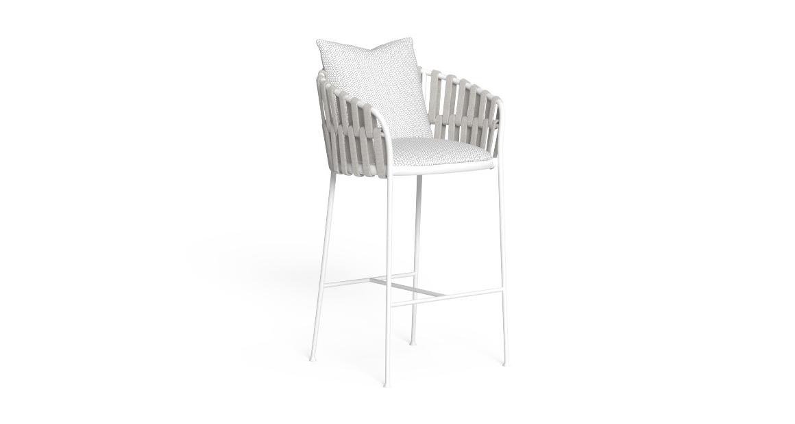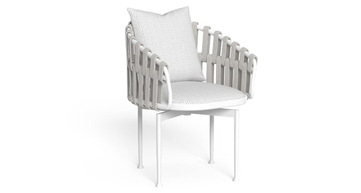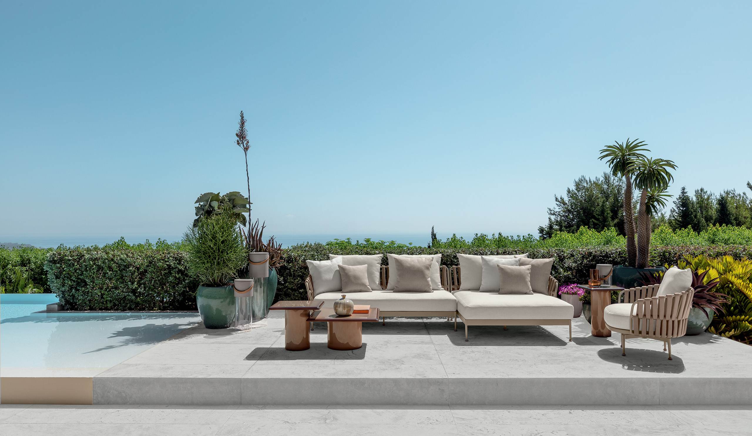 Caratterizzati dall’accostamento di strutture in alluminio, intrecci in corda e morbide cuscinature in tessuto, il sofa modulare esprime un’eleganza rilassata e contemporanea. L’intreccio della corda imbottita avvolge la struttura con leggerezza, disegnando una texture raffinata che filtra la luce e genera giochi di ombre naturali. I volumi si incontrano in un equilibrio di linee sensuali e proporzioni armoniche, offrendo un comfort avvolgente e una privacy visiva discreta.
