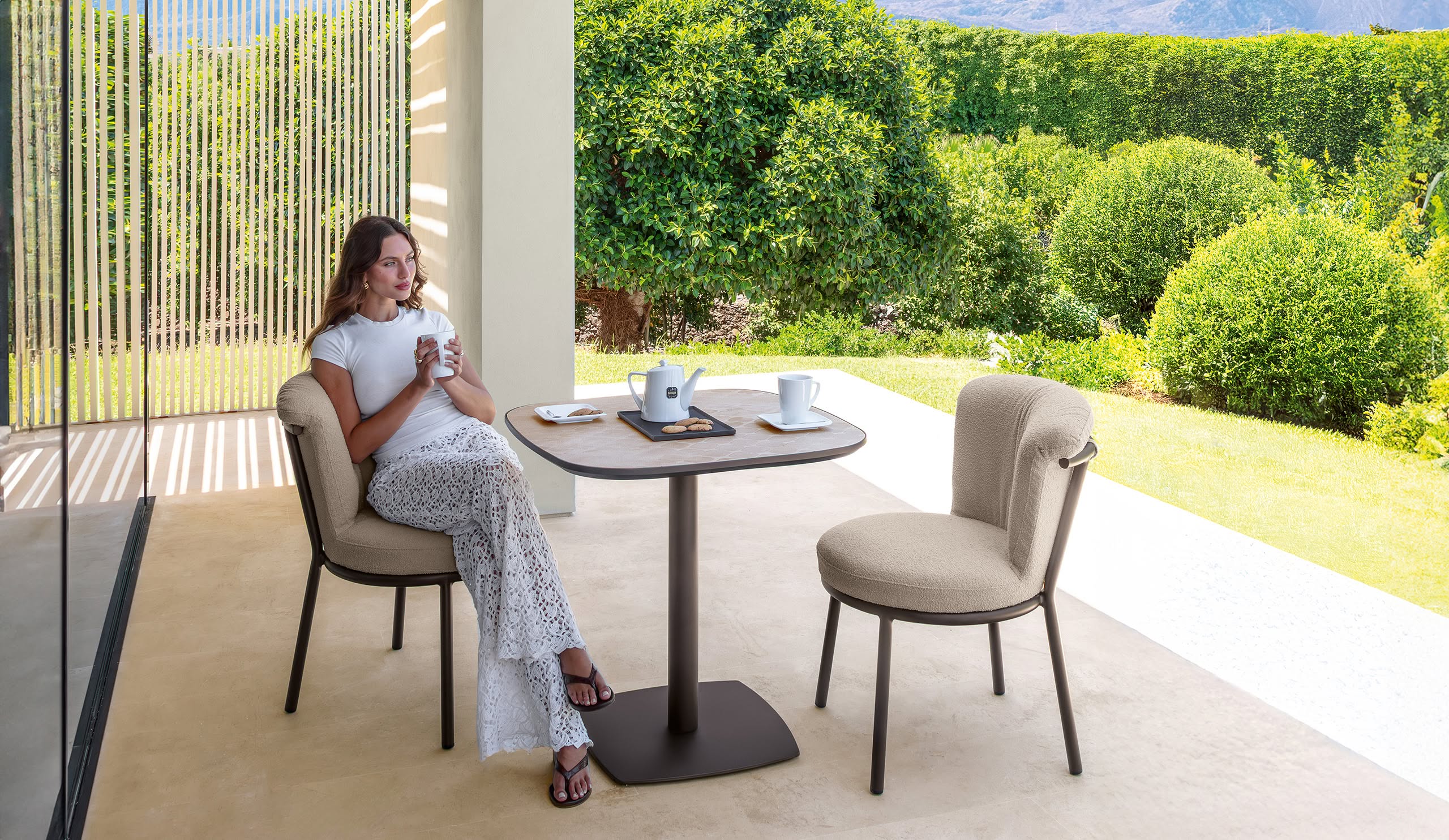 La struttura in alluminio verniciato, solida ma visivamente leggera, sostiene una seduta morbida e accogliente che invita alla convivialità e al relax.