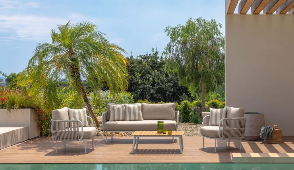 La struttura in alluminio verniciato e l’intreccio in corda sintetica dialogano con la morbidezza della cuscineria, creando una silhouette equilibrata e accogliente.