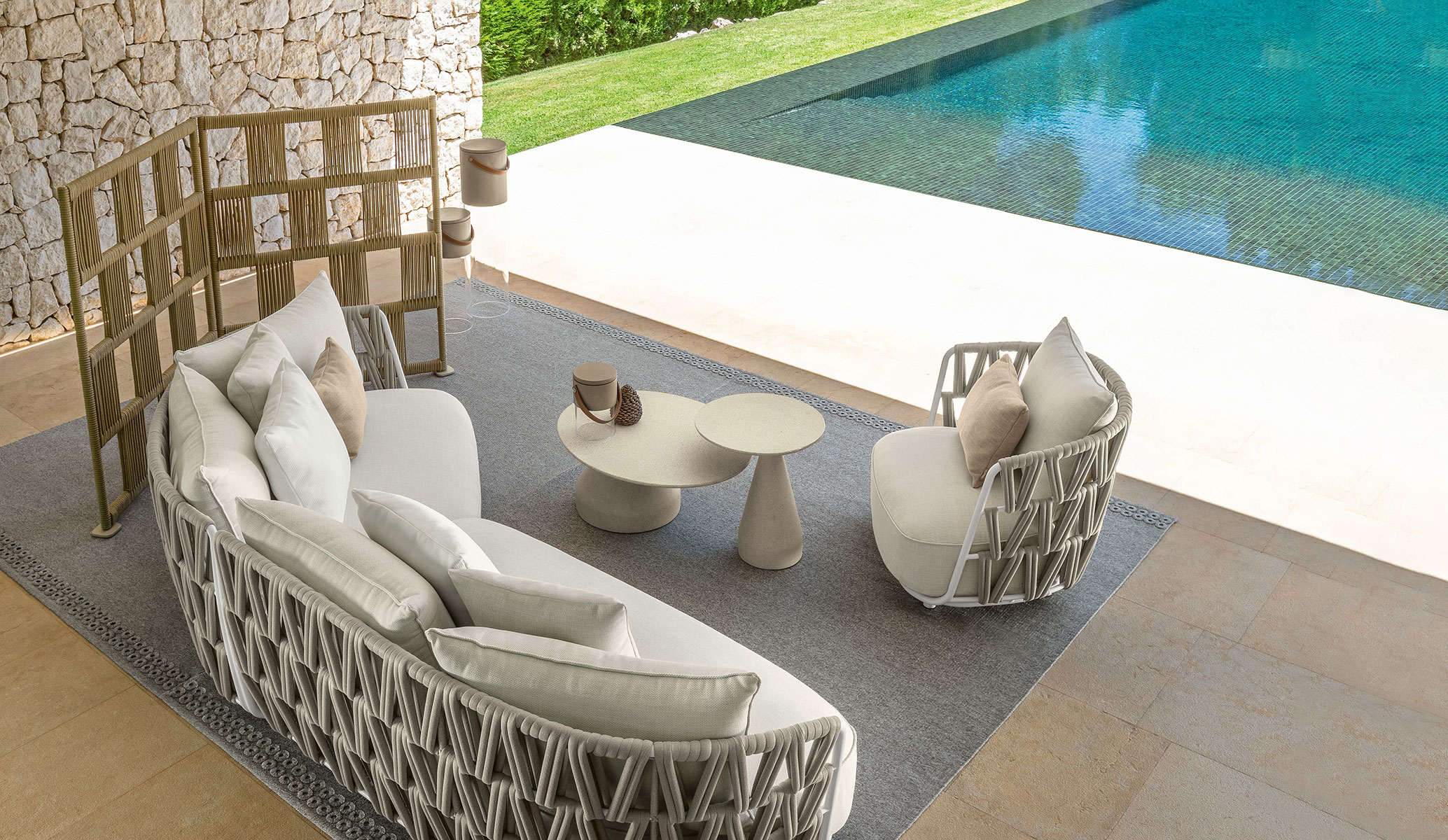 La poltrona girevole Swipe è giocosa e confortevole, perfetta per godersi i momenti di relax in giardino. La struttura in alluminio abbraccia la seduta caratterizzata da una cuscinatura morbida e generosa. Corde imbottite s’intrecciano con ritmo geometrico e dinamico intorno al tubolare in alluminio, conferendo a schienale e braccioli una maggiore comodità. Una soluzione di design che valorizza il living esterno con leggerezza e personalità.