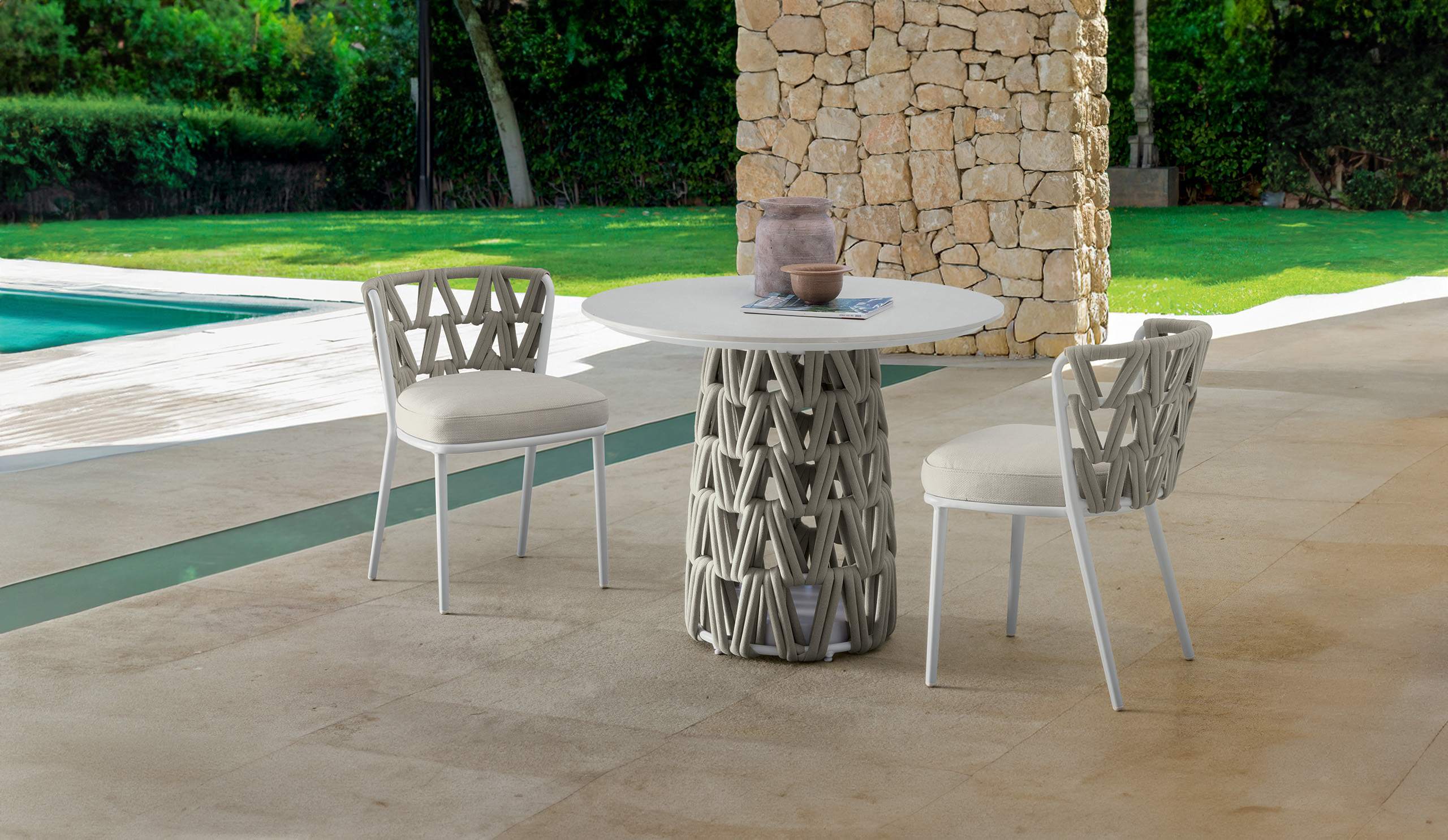 Dinamismo e movimento sono i concetti che hanno ispirato il design del tavolo da pranzo Swipe. Questo elemento d’arredo dona leggerezza ai momenti di convivialità in giardino, grazie al ritmo geometrico delle corde imbottite che rivestono la struttura tubolare in alluminio. Questo elemento giocoso, dona carattere al living esterno e intrattiene lo sguardo con la sensazione che il sottile piano in gres sia fluttuante.